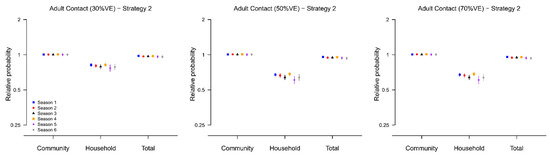 In the optimal scenario where the direct VE was 70%, we found that, compared to the no vaccination scenario, the probability of household infection for unvaccinated adult contacts was almost halved under both strategies, with relative probabilities ranged from 0.62–0.68 under strategy 1 and 0.44–0.54 under strategy 2 over the six epidemics (Figure 4 and Figure 5). However, the reduction in the total probability of infection was only marginal, with relative probabilities ranged from 0.93–0.96 for strategy 1 and 0.91–0.94 for strategy because the community was by far the main source of infection during the six epidemics in our study (Supplementary Figures S2–S4).