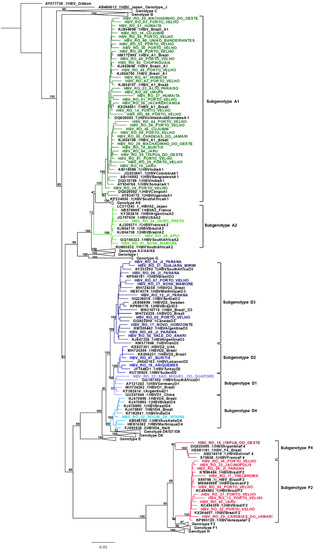 - Barros, L.M.F.; Gomes-Gouvêa, M.S.; Kramvis, A.; Mendes-Corrêa, M.C.J.; dos Santos, A.; Souza, L.A.B.; Santos, M.D.C.; Carrilho, F.J.; de Jesus Domicini, A.; Pinho, J.R.R.; et al. High Prevalence of Hepatitis B Virus Subgenotypes A1 and D4 in Maranhão State, Northeast Brazil. Infect. Genet. Evol. 2014, 24, 68–75. [Google Scholar] [CrossRef]