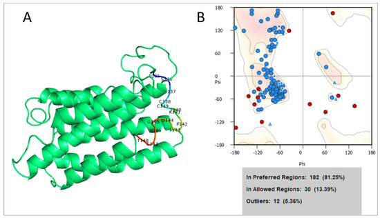 (A) Three-dimensional structure of HBsAg of a conserved epitope of HBV-RO-10. The antigenic region used in molecular docking is highlighted in the image; (B) Ramachandran plot. Blue dots and triangles represent residues in favored regions and red dots indicates the outliers residues. Images generated by PyMOL©.