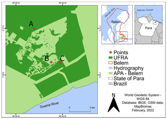 Location of the UFRA inside the APA-Belem (Pará, Brazil), with the demarcation of points for collecting hematophagous arthropods (A and C) and capturing free-ranging birds (B and C). A—Animal Husbandry sector. B and C—Veterinary Medicine sector.