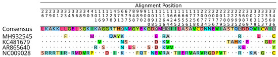 - Katoh, K.; Standley, D.M. MAFFT multiple sequence alignment software version 7: Improvements in performance and usability. Mol. Biol. Evol. 2013, 30, 772–780. [Google Scholar] [CrossRef] [PubMed]