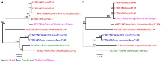 To construct the phylogenetic tree, two partial fragments corresponding to the coding regions of the envelope proteins and NS5 of the nucleotide sequence obtained in the present study, together with partial sequences referring to the same proteins from strains of ILHVs available at the NCBI, were submitted to multiple sequence alignment using the Maft program v.7 [36]. The aligned data were analyzed to identify the best nucleotide substitution model, and the phylogenetic trees were constructed using the maximum likelihood (MV) method [37] in the IQ-TREE v.1.6.12 program [38]. A bootstrap test was applied using 1000 replicates [39] to add greater reliability to the clusters. FigTree v.1.4.4 (https://www.github.com/rambaut/figtree/releases/tag/v.1.4.4, accessed on 9 February 2022) was used to visualize the phylogeny, and the final image was produced using InkScape v.1.1 (https://inkscape.org/release/inkscape-1.1/, accessed on 9 February 2022).