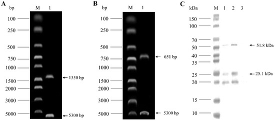 In recent years, the development of genetically engineered vaccines has become the focus of CIAV vaccine research. Studies have shown that the antibody response produced by the VP1 protein alone is weak, while the co-expression of the VP1 and VP2 proteins has stronger immunogenicity [22,25]. At present, a variety of expression systems are used to express VP1 alone or the VP1-VP2 protein to prepare CIAV subunit vaccines, such as E. coli expression systems, yeast expression systems, silkworm, tobacco, etc. [25,26,27]. Due to the weak immunogenicity of subunit vaccines, adjuvants are often added to enhance the immune effect, such as oil emulsion adjuvant and CpG adjuvant [21]. Researchers have also tried to integrate different genes, such as IFN-γ and the VP22 gene of Marek’s disease virus, to the VP1 sequence to enhance the immunogenicity of subunit vaccines [20,28]. In this study, full-length recombinant VP1 protein and VP2 protein of CIAV were respectively expressed in E. coli, and the temperature, induction time, and IPTG concentration were adjusted to realize the soluble expressions of VP1 and VP2 proteins. It should be pointed out that we tried to ligate the VP1 gene to the pET28-a(+) vector first; however, the protein was not successfully expressed. Therefore, the VP1 gene was cloned into the pET32-a(+) vector, and recombinant VP1 with a tag was successfully expressed.