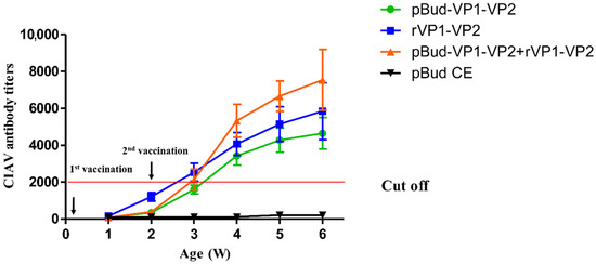 A DNA vaccine and a subunit vaccine were prepared based on the plasmid pBud-VP1-VP2 and recombinant proteins. To prepare the DNA vaccine, plasmid pBud-VP1-VP2 (1 μg/μL) was mixed with liposomes (ABclonal, Wuhan, China) at a volume ratio of 1:1. To prepare the subunit vaccine, recombinant VP1 and VP2 proteins were first mixed equivalently and then mixed with Freund’s complete adjuvant at a ratio of 1:1. A total of 60 1-day-old SPF chickens purchased from Jinan SAIS Poultry Co., LTD were randomly divided into 4 groups, with 15 chickens in each group (Table 2). Chickens in group 1 (DNA vaccine group) were immunized with 100 μg pBud-VP1-VP2 plasmid intramuscularly at both 1 day old and 14 days old. Chickens in group 2 (subunit vaccine group) were immunized with 100 μg subunit vaccine subcutaneously at both 1 day old and 14 days old. Chickens in group 3 (combined vaccine group) were immunized with 100 μg DNA vaccine at 1 day old and then immunized with 100 μg subunit vaccine at 14 days old. Chickens in group 4 (PBS control group) were injected with PBS buffer subcutaneously at both 1 day old and 14 days old. After the first immunization, serum was collected weekly, and the anti-CIAV antibody was detected using a CIAV antibody detection kit (IDEXX, Westbrook, ME, USA).