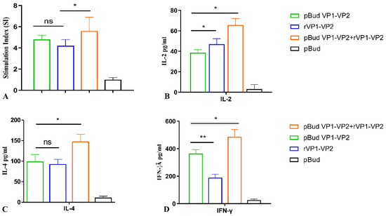 Detection of SI index of splenic lymphocytes and expression levels of IL-2, IL6, and IFN-γ in vitro. (A): SI index of splenic lymphocytes stimulated with VP1 protein in vitro. (B): Expression levels of IL-2 of spleen lymphocytes stimulated with VP1 protein in vitro. (C): Expression levels of IL-6 of spleen lymphocytes stimulated with VP1 protein in vitro. (D): Expression levels of IFN-γ of spleen lymphocytes stimulated with VP1 protein in vitro. Differences were considered significant when p ≤ 0.05 (*) and highly significant when p ≤ 0.01 (**); the error bars represent the SEM; ns, no significant difference (p > 0.05).