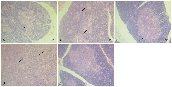 Section observation of chicken thymuses in different groups after CIAV challenge. (A): Chicken thymus of DNA vaccine group (100×). (B): Chicken thymus of subunit vaccine group (100×). (C): Chicken thymus of combined vaccine group (100×). (D): Chicken thymus of CIAV infection control group (100×). (E): Chicken thymus of blank control group (100×).
