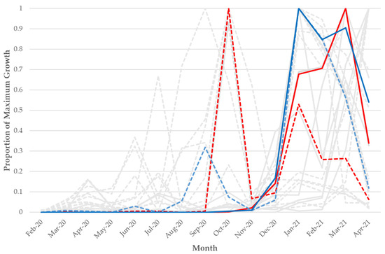 Frequency over time of the n = 15 VoC/VoI mutations that had a substantial increase as a minor variant prior to a rise as a fixed variant across 411,805 NCBI SRA SARS-CoV-2 samples. The Y-axis is scaled by the maximum count for each particular mutation and scaled separately for minor variant and fixed mutations. Dotted lines represent minor variant mutations and solid lines represent fixed mutations. The red solid and dotted lines represent the A23063T/N501Y mutation/change, and the blue solid and dotted lines represent the T22917G/L452R mutation/change. The grey lines represent the other 13 VoC/VoI mutations that had a substantial increase as a minor variant prior to a rise as a fixed variant (each is also found in Figure S1).
