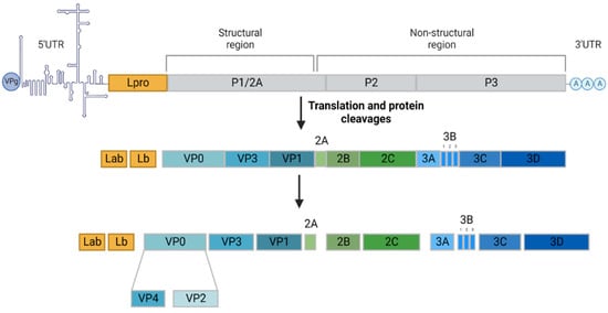 Foot-and-mouth disease virus genome structure and viral protein expression. The FMD virus has a small genome (about 8.5 kb) encoding four structural proteins, VP4, VP2, VP3 and VP1, forming the capsid, and eleven nonstructural proteins, Labpro, Lbpro, 2A, 2B, 2C, 3A, 3B1, 3B2, 3B3, 3C and 3D, responsible for the infectious cycle. Adapted with permission from Belsham et al., 2020 [2]. Created with BioRender.com (accessed on 15 August 2022).