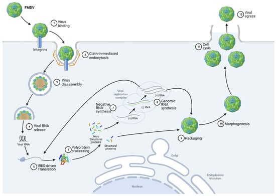 Foot-and-mouth disease virus replication cycle (See text for details). Created with BioRender.com (accessed on 15 August 2022).