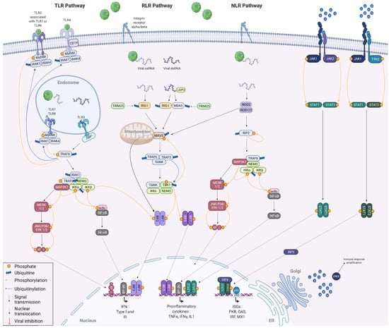 Innate antiviral immune responses against viral infection. The induction of the IFN response results from the recognition of characteristic viral patterns by cellular membranous or cytoplasmic receptors. Activation of these receptors triggers a signalling cascade in the cell, leading to the activation of transcription factors involved in IFN alpha and beta and proinflammatory cytokine production. Finally, the signalling phase consists of the binding of IFN-alpha and -beta to their receptors, which generates an activation signal that is propagated into the cell via the JAK/STAT pathway to enable the expression of numerous proteins with antiviral or immunomodulatory activity. Created with BioRender.com (accessed on 15 August 2022).
