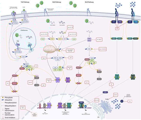 When synthesised by the ER, IFNs pass through the Golgi before diffusing into the cellular environment. IFNs can act both autocrine and paracrine. To do so, they are recognised by interferon alpha/beta receptors (IFNAR) [42]. The binding of IFN molecules to these membrane receptors induces the activation of the Janus kinase 1 (JAK1), JAK2 and nonreceptor tyrosine-protein kinase TYK2 proteins [43]. Once activated, these JAK proteins lead to a phosphorylation cascade resulting in the phosphorylation and association of the signal transducer and activator of transcription 1 (STAT1) and STAT2 into homo- or heterodimers [44]. On the one hand, STAT1 homodimers thus assembled translocate to the nucleus where they bind to proinflammatory cytokine promoters to amplify the host inflammatory response. On the other hand, STAT1/STAT2 heterodimers form a complex with IRF9. This complex also translocates to the nucleus and binds specifically to the interferon-stimulated response element (ISRE), present in most IFN-stimulated (ISGs), to induce their expression and activate the antiviral response [27]. The detailed mechanisms involved in the IFN response are illustrated in Figure 2 of this review. Some acute infections can be cleared by the immune system within days, while other infections can be persistent and last for decades. This is because the efficiency of viral clearance depends on many factors, including the immune status of the host, the nature of the virus causing the infection and, most importantly, the virus–host interaction that is established. The IFN response and the resulting ISG expression are thus regulated, even highjacked by the viruses throughout the infection in order to either stimulate it to promote passage into the surrounding cells or to decrease it to avoid being degraded [45].