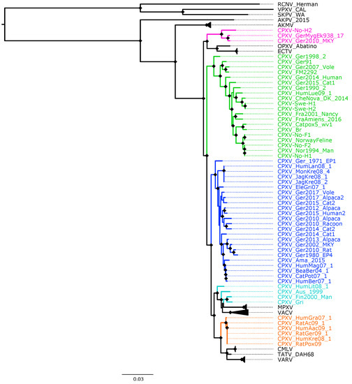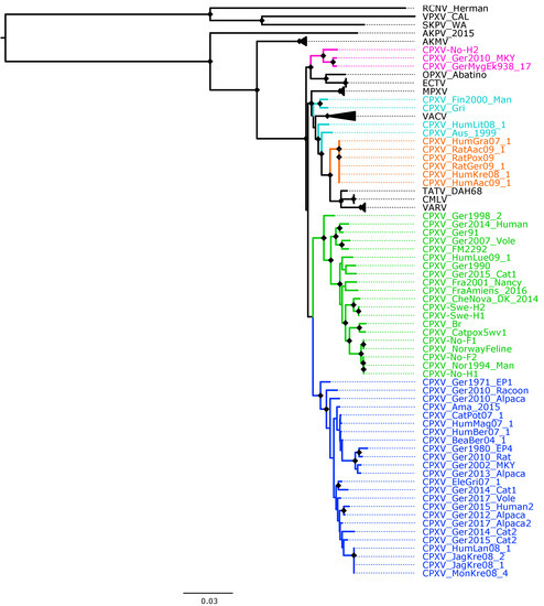 - Franke, A.; Pfaff, F.; Jenckel, M.; Hoffmann, B.; Höper, D.; Antwerpen, M.; Meyer, H.; Beer, M.; Hoffmann, D. Classification of Cowpox Viruses into Several Distinct Clades and Identification of a Novel Lineage. Viruses 2017, 9, 142. [Google Scholar] [CrossRef] [PubMed]