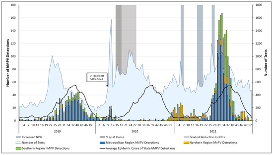 hMPV was consistently detected in the Metropolitan region from week 21 of 2021 (Figure 1 and supplementary Figure S2A). A sharp increase in detections was observed on week 26, contemporaneous with a short period of increased NPIs in this region. hMPV was commonly detected in the Southern region from week 30 of 2021 (Figure 1 and supplementary Figure S2C). State-level detections peaked at week 33 dropping to low levels by week 41, 2021.