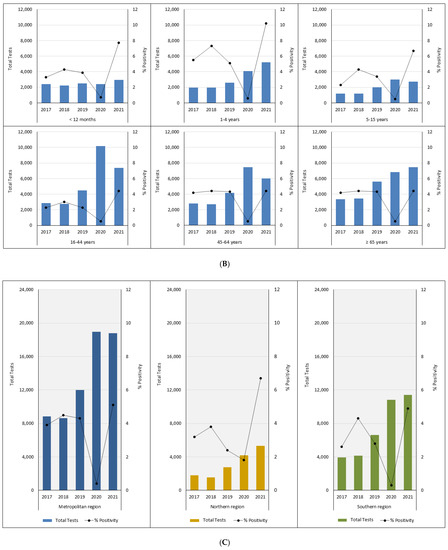 (A) Total hMPV tests and percentage positivity per year in Western Australia; (B) Total hMPV tests and percentage positivity per year by age groupings; (C) Total hMPV tests and percentage positivity per year by age groupings by region.