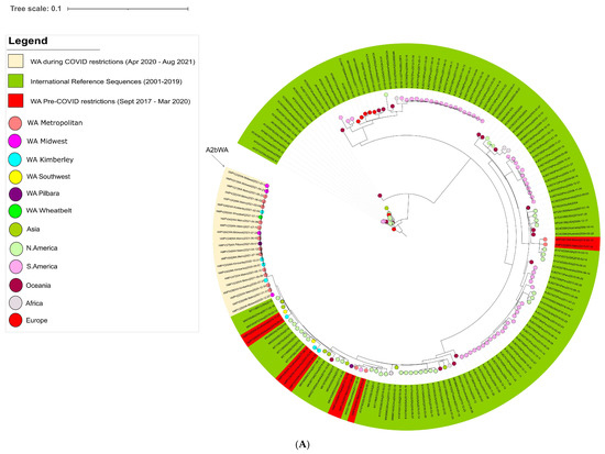 Genomes generated from samples taken before the emergence of SARS-CoV-2 were distributed throughout the phylogeny, belonging to either B.1, B.2 or A.2b lineage, with multiple lineages observed during a single season (Figure 3 and Supplementary Figure S4). In contrast, following the reduction in SARS-CoV-2-associated NPIs, a novel monophyletic clade of hMPV A.2.2 viruses emerged, here designated as A2.bWA. hMPV A2.bWA was first detected in July 2020 in the northern region of WA and subsequently became the single strain detected during the 2021 minor season in the Northern region and the subsequent primary season in the Metropolitan and Southern regions. A2.bWA viruses were most closely related to a 2019 USA hMPV A.2.2 sequence (GenBank accession number MT118691) and 2019 hMPV A2.b viruses sampled in WA which was sequenced as part of this study.