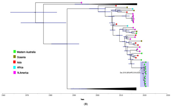 - Suchard, M.A.; Lemey, P.; Baele, G.; Ayres, D.L.; Drummond, A.J.; Rambaut, A. Bayesian phylogenetic and phylodynamic data integration using BEAST 1.10. Virus Evol. 2018, 4, vey016. [Google Scholar] [CrossRef] [PubMed]