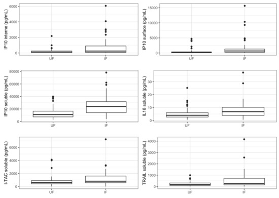 Concentrations of relevant cytokines according to fetal infection. Boxplots represent variations in cytokines’ concentrations (median). UF: uninfected fetuses, IF: infected fetuses.
