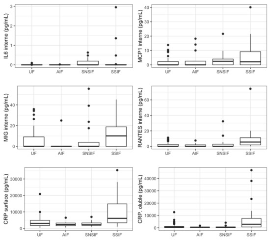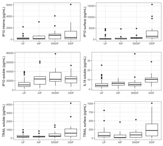 Concentrations of relevant cytokines according to symptomatic state at birth and severity. Boxplots representing represent variations in cytokines’ concentrations (median). UF: unifected fetuses, AIF: asymptomatic infected fetuses, SNSIF: symptomatic and non-severe infected fetuses, SSIF: symptomatic and severe infected fetuses.
