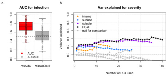 For infection, the prediction model was derived from multiple logistic regressions using five PCs, and prediction accuracy measured using the area under the roc curve (AUC). Given the limited sample size, the AUC was derived as the average over 50 rounds of cross-validation to limit overfitting. For each round, a training set including 80% of the data was randomly chosen to estimate regression coefficients, and the remaining 20% was used as a test set.