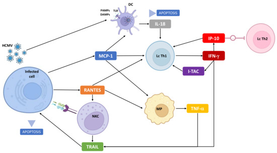 hCMV has developed various mechanisms to evade the immune response, including modulation of cytokine response [28,69,76,77]. The main one uses a CMV homolog of IL-10 to reduce the immune response [76]. CMV also encodes homologs of cytokine receptors, binding RANTES, e.g., which contribute to anti-inflammatory evasion [78]. hCMV reduces the expression of TRAIL-DR, leading to a restriction of the TRAIL/TRAIL-DR pathways and viral proliferation [56]. Figure 4 summarizes the previous discussion, especially interactions between relevant cytokines and immune system cells.