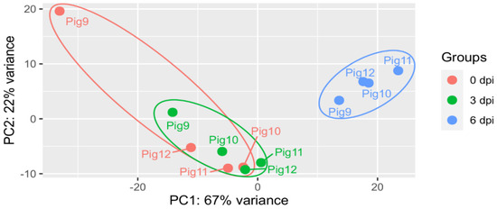 PCA across different sampling days. Pigs were inoculated intranasally with ASFV/POL/2015/Podlaskie at 0 dpi and euthanised at 6 dpi. Blood samples were collected at 0 dpi (prior to inoculation), at 3 dpi and at 6 dpi (before euthanasia) from each of the 4 pigs. PBMCs were purified from the blood and poly(A)+ mRNA purified and analysed by sequencing (see Materials and Methods). Approximately 27–42 million reads were obtained from each sample and assessed using PCA. The samples from each pig (9–12) on each sampling day are indicated.