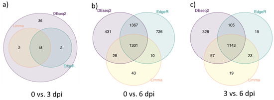 Differential gene expression analyses across 3 pairwise comparisons using 3 different methods. Venn diagrams of the differentially expressed genes (DEGs) in PBMCs from pigs collected at 0 dpi, 3 dpi and 6 dpi. (a) Venn diagram showing the overlap between the DEGs identified by the DEseq2, glmQL for EdgeR and Limma packages (see Materials and Methods) shown in lilac, blue and yellow, respectively, between PBMCs from the uninfected (0 dpi) and infected pigs at 3 dpi. (b) Venn diagram of the DEGs detected by these same packages between the PBMCs from uninfected pigs (0 dpi) and from infected pigs at 6 dpi. (c) Venn diagram of the DEGs between PBMCs collected from pigs at 3 and 6 dpi.