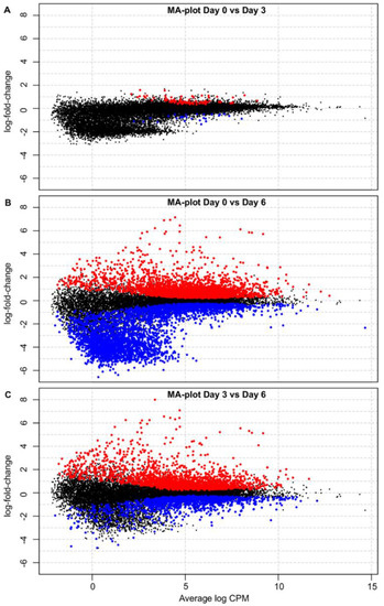 The host gene expression was compared, using EdgeR, in PBMCs taken from the pigs at 0, 3 and 6 dpi and displayed using MA plots (Figure 3). At 3 dpi, few changes in gene expression were apparent (Figure 3A). Both up-regulation (shown in red) and down-regulation (in blue) were observed, but these changes were generally small in magnitude (only about 1 log2 change). In contrast, at 6 dpi, a large number of genes were differentially expressed (Figure 3B). As may be expected from the great change in the level of virus replication that occurred in this period [16], most of the significant changes in gene expression occurred between 3 and 6 dpi (Figure 3C). Many (>1100) different host genes were markedly changed in their expression during this time (Figure 2c), either increased or decreased.