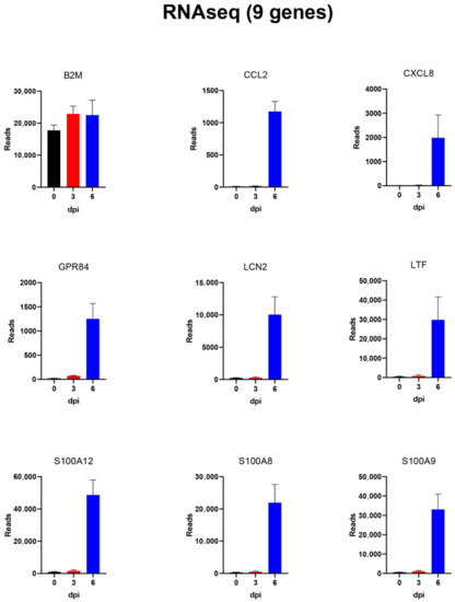 To confirm the results of the RNAseq analysis, the expression of a selection of almost 40 different host genes (including reference genes) was also analysed using microfluidic qPCRs (see below). For ease of comparison, the results for this selected set of genes, as determined by RNAseq, are shown in Table 1, while the results for the qPCR assays are shown in Table 2. Graphical representations of the changes in expression detected by RNAseq for some of these selected genes are shown in Figure 4 and Figure 5. The mean values (from the four pigs) of the normalised reads for eight genes, whose expression was greatly increased (see Table 1), along with B2M (beta-2 microglobulin) acting as a reference gene, are shown in Figure 4. The expression of the reference gene was barely changed throughout the course of the infection, as expected. In contrast, the expression of CCL2, CXCL8, GPR84, LCN2, LTF, S100A12, S100A8 and S100A9 was greatly enhanced (ca. 50–100-fold) at 6 dpi, but with little or no change observed at 3 dpi. Expression levels of a further 12 genes are shown in Figure 5; the changes in expression of these genes were more moderate than those shown in Figure 4. These included a number of genes that contribute to an antiviral state that are induced by type I and type III interferons (e.g., IRF7, ISG15, ISG20 and OAS) or more directly by the presence of dsRNA (i.e., RIG-I (DDX58)). There was little change in the expression of IRF3 during the course of the infection, but these other genes were expressed at ca. 5–10-fold elevated levels at 6 dpi (Figure 5) compared to 0 dpi. It is noteworthy that the expression levels of the interferon-sensitive genes IRF7, ISG15, ISG20 and OAS1 (and RIG-I, which is also involved in the interferon response) were slightly increased at 3 dpi, in each case, but the changes were much greater at 6 dpi (Figure 5 and Table 1).