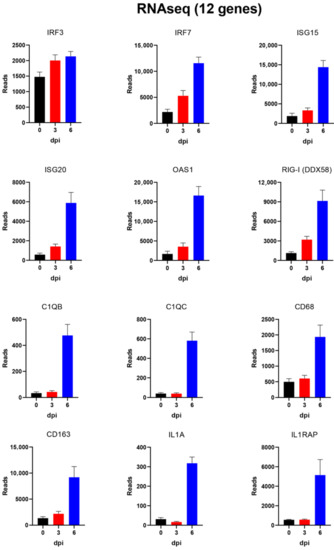 Some of the genes in the PBMCs that were most highly increased in expression at 6 dpi are well-known cytokine genes such as CCL2 and CXCL8. A variety of other genes known to have a role in inflammatory responses (e.g., IL1A and IL1RAP) and antiviral responses (ISG15, ISG20 and RIG-I) were also more highly expressed. These changes in gene expression were detected initially by the RNAseq analysis (Table 1, Figure 4 and Figure 5) but were then confirmed using microfluidic qPCRs (Table 2, Figure 6 and Figure 7). There is a high degree of agreement between the different types of assay for which genes are expressed at an elevated level or not. This increases confidence in both approaches, which each have their own advantages and disadvantages.