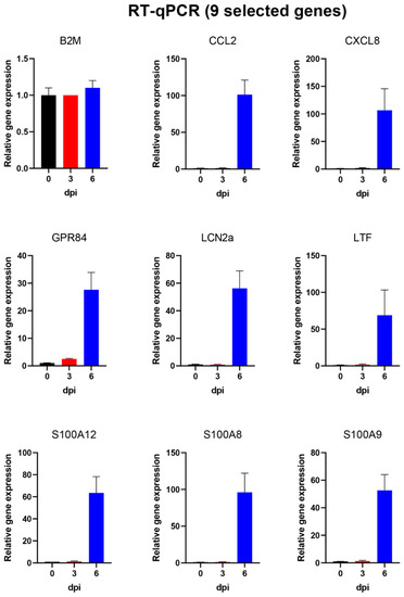 As indicated above, the RNA samples prepared from the purified PBMCs were also assayed for expression of 37 different genes (including some reference genes selected for standardisation purposes) using high-throughput qPCR assays (see Table 2). The genes analysed in this way were chosen on the basis of the changes observed by RNAseq and the availability of validated assays (as used previously for studies on influenza virus-infected pigs [24]). The results of some of these analyses are shown in Figure 6 and Figure 7 for the same sets of genes shown in Figure 4 and Figure 5 from the RNAseq analyses. As expected, the B2M reference gene was again found to be expressed at similar levels throughout the infection period. In addition, consistent with the RNAseq results, expression of some of the selected genes was shown (see Figure 6) to be strongly increased (up to 100-fold) at 6 dpi (i.e., CCL2, CXCL8, GPR84, LCN2, LTF, S100A12, S100A8 and S100A9). Furthermore, expression levels of a further 11 genes, including various genes involved in the development of an antiviral state, were shown to be markedly enhanced (>3–10-fold) at 6 dpi, while IRF3 expression was not changed (Figure 7). It is apparent that the two approaches to analyse gene expression, using RNAseq (Figure 4 and Figure 5) and qPCR assays (Figure 6 and Figure 7), provided similar patterns of results.