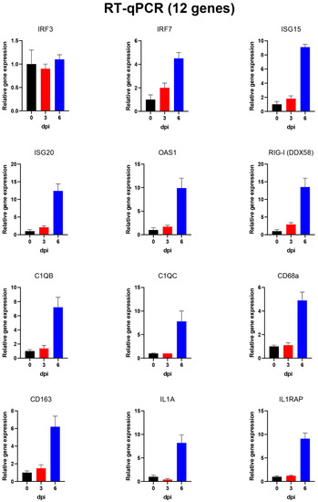 Expression of 12 selected host genes in PBMCs from ASFV-infected pigs. The relative expression levels (mean of 4 pigs +SEM) for these selected genes, as determined by qPCR assays, are shown for the PBMCs collected at 0, 3 and 6 dpi. All the genes (except for IRF3) were expressed at 4–12-fold higher levels at 6 dpi compared to 0 dpi.