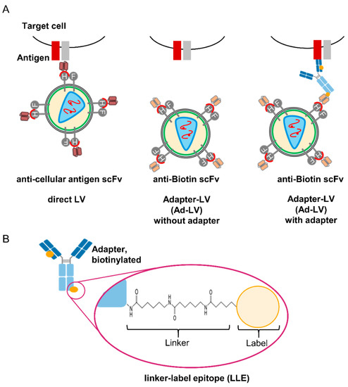 Concept of LLE adapter-mediated transduction with lentiviral vectors. (A) For directly targeted LVs, a binding ligand (e.g., scFv) is fused to the H protein of MV that is mutated to block natural receptor interactions. This allows specific entry to cells expressing the respective antigen (left). The adapter-mediated transduction is based on an scFv fused to the H protein of MV pseudotyped LVs, which binds to biotin on a specific adapter molecule. In the absence of adapter molecules, transduction is abolished (middle). Only in the presence of a biotinylated adapter molecule transduction with the Adapter-LV (Ad-LV) is mediated (right). (B) Here, antibodies or antibody fragments were used as adapter molecules. The specific linker chemistry used for biotinylation generates a linker moiety and a label moiety (biotin). The scFv used in this study interacts with the linked biotin (linker–label epitope, LLE) thereby avoiding recognition of free biotin.