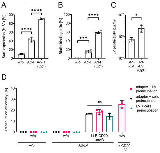 A 2-fold increase in HIS-positive cells and a 4-fold increase in biotin-binding cells was observed when Ad-H(opt) was expressed, suggesting improved surface-expression and antigen-binding capacity. Next, LVs were generated via the transient transfection of HEK293T cells. To determine an adapter-independent functional titer, LVs were titrated on biotinylated cells. For this, surface proteins of HT1080 cells were randomly labeled using NHS-linked biotin, followed by transduction with serially diluted LVs and the quantification of GFP-expressing cells via flow cytometry (Figure S1). In line with improved surface expression, the productivity of the Ad-LV generated with the Ad-H(opt) was enhanced 3-fold as compared to Ad-H (Figure 2C and Figure S1). The significant increase in productivity prompted us to apply Ad-LVs with Ad-H(opt) in all subsequent experiments.