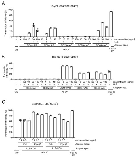 Flexibility of Ad-LV towards adapter specificity and format. The flexibility of the adapter system was evaluated by transduction of cell lines using different adapter specificities. SupT1 (CD4 + CD8 + CD46+) (A) and Raji cells (CD19 + CD20 + CD46+) (B) were left untreated (w/o) or were transduced with GFP-encoding Ad-LV with 0.2 TU/cell using LLE-CD4 (clone: MT-466), LLE-CD8 (clone: BW135/80), LLE-CD19 (clone: LT19), LLE-CD20 (clone: LT20), and LLE-CD46 (clone: REA312) mABs (+) in concentrations ranging from 1 to 1000 ng/mL. Non-biotinylated mABs (-) used in the highest concentration and transduction in the absence of any adapter (-) were used to confirm specificity. VSV-G LV was used as reference. Transduction efficiency was analyzed 3 days (Raji) or 4 days (SupT1) post transduction via quantification of GFP-positive cells using flow cytometry. (C) Transduction efficiency of SupT1 comparing fab and f(ab)2 adapter formats of the same LLE-CD4 or LLE-CD8 clone with adapter concentrations ranging from 0.1 to 1 μg/mL using a GFP-encoding Ad-LV (0.1 TU/cell). VSV-G LV was used as reference. Data are represented as mean ± SD of 3 technical replicates.