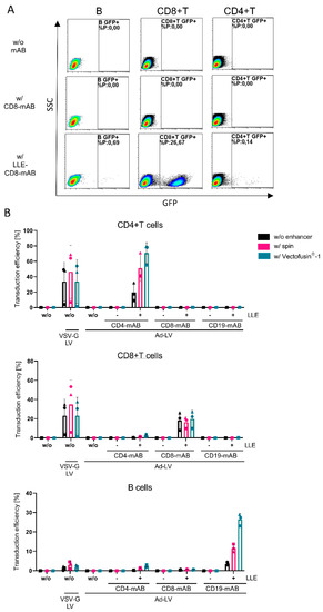 Selective transduction of human T and B cells within activated PBMCs using different transduction protocols. Activated PBMCs were transduced with Ad-LVs with 0.1 TU/cell in the absence of adapter (w/o) and in the presence of CD4-mAB (clone:MT-466, 100 ng/mL), CD8-mAB (clone: BW135/80, 10 ng/mL), or CD19-mAB (clone: LT19, 100 ng/mL) with (+) or without LLE-tag (-). (A) Representative data are shown using LLE-CD8 mAB or CD8-mAB w/o enhancer. (B) Three transduction conditions were compared: using no enhancers, using spinoculation, or the transduction enhancer Vectofusin®-1. VSV-G LVs were used as positive control. Transduction efficiency was evaluated 10 days post transduction gated on the subpopulations (CD4+ T cells, CD8+ T cells, and B cells). Data are represented as mean ± SD of 3 different donors and 2 independent experiments.