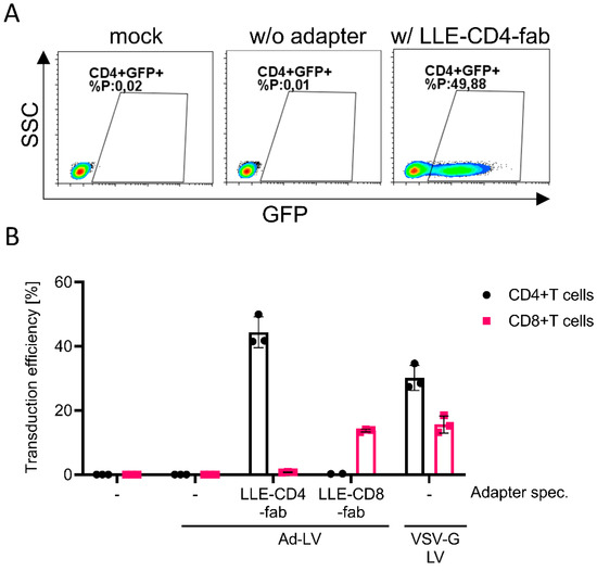 Next, we evaluated if Ad-LVs may also be used for the selective transduction of murine T-cell subsets. Murine T cells were isolated from the spleens of C57BL/6 mice and stimulated overnight with IL-2 and mouse T-activator. The cells were either left untreated or were transduced with Ad-LVs in the absence of an adapter or in presence of LLE-CD4 and LLE-CD8 fab (Figure 6).
