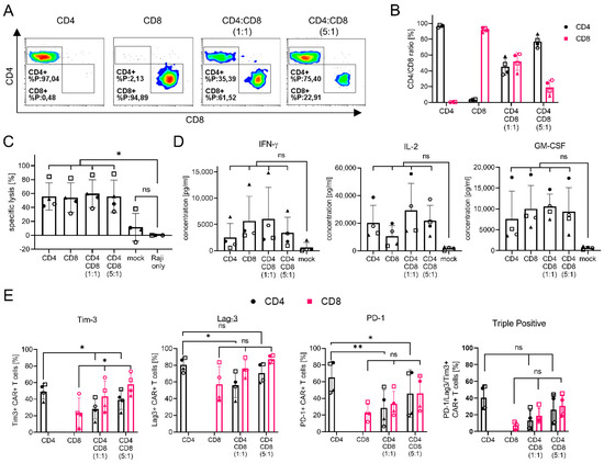 Cytokine levels were strongly donor-dependent, resulting in no significant differences between the CAR-T products. Nevertheless, a tendency toward the enhanced secretion of IFN-γ was observed with higher frequencies of CD8+ CAR-T cells, while IL-2 secretion dropped in the absence of CD4+ CAR-T cells. Finally, 6 days post setup of the co-culture, the exhaustion/activation surface markers of the T cells were analyzed (Figure 7E). The ratio of CD4+ CAR-T cells expressing Tim-3 or PD-1 significantly dropped in the presence of CD8+ CAR-T cells. In contrast, Tim-3 expression on CD8+ CAR-T cells significantly increased in the presence of CD4+ CAR-T cells. No significant differences were observed in Lag-3 for CD8+ CAR-T cells, while expression on CD4+ CAR-T cells was only reduced with a high amount of CD8+ CAR-T cells. The same tendencies were observed on triple-positive T cells; however, no significant difference was observed. These effects are results of the fact that transduction can be excluded, since no significant differences in marker expression were observed before the co-culture setup (Figure S4). Most importantly, no significant differences in marker expression were observed on the non-modified T cells, confirming a CAR-specific effect (Figure S4). The additional analysis of less favorable E:T ratios, tumor re-challenge, and the analysis of phenotype and gene expression may uncover further differences between CD4+ and CD8+ CAR-T cells. Since the result will likely be affected by CAR design, the binding domain, and tumor entities, the evaluation of anti-tumor activity with additional tumor cell lines as well as in vivo analysis would be of value.