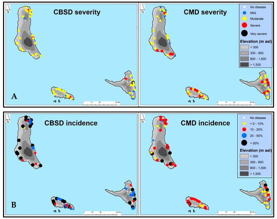 Map of Comoros showing the distribution of cassava brown streak disease and cassava mosaic disease in Comoros, July 2019. CBSD: cassava brown streak disease; CMD: cassava mosaic disease. (A) CBSD and CMD severities in Comoros, July 2019. Disease severity scores were determined according to Cours, (1951) [32] and Gondwe et al. (2003) [33]. The colored bullets represent disease scores where: white = score 1 (no symptoms), blue = average score 2 (2 < 3; mild symptoms), yellow = average score 3 (moderate symptom), red = average score 4 (3.1 < 4; severe symptom), and black = average score 5 (scores 4.1 ≤ 5; very severe symptom). (B) CBSD and CMD incidences in Comoros, July 2019.
