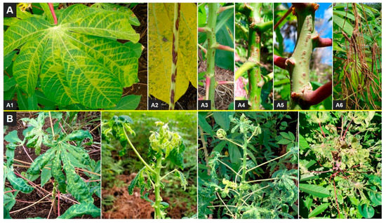 Foliar symptoms of cassava brown streak disease (CBSD) and cassava mosaic disease (CMD) observed in Comoros, July, 2019. Panel (A): Different foliar symptoms of CBSD observed on different varieties in Comoros: (A1), feathery necrotic lesions on leaf; (A2), necrotic lesions on leaf petiole; (A3–A5), different patterns of necrotic lesions observed on the green parts of shoots of different varieties; (A6), shoot of cassava showing severe necrotic lesions and dieback. Panel (B): CMD symptom patterns observed on different cassava varieties in Comoros.