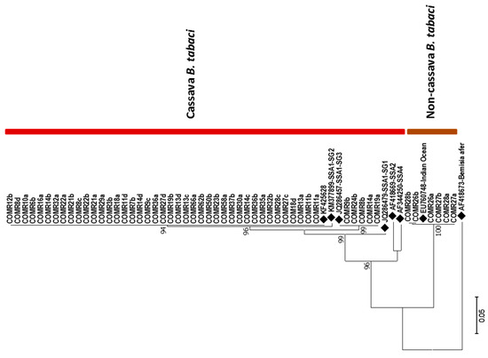 CBSD is caused by cassava brown streak ipomoviruses (CBSIs; which is the standard name for the two cassava brown streak viruses together) [7,8,9,10] and CMD by cassava mosaic begomoviruses (CMBs) [11,12,13]. Both groups of viruses are propagated by infected planting material and transmitted by the whitefly vector, Bemisia tabaci (Genn.) [14,15]. B. tabaci comprises many morphologically identical populations but with genetically distinct mitotypes designated based on the partial sequencing of the COI gene [16,17]. The cassava-colonizing group is subdivided into several mitotype sub-groups (SG) [18,19,20,21]. A more recent study used more than 60,000 SNPs to reassign all the known cassava B. tabaci mitotypes into six SNP-based haplogroups [22]. Currently there is no knowledge of the diversity of cassava-colonizing whiteflies in the Comoros Islands.