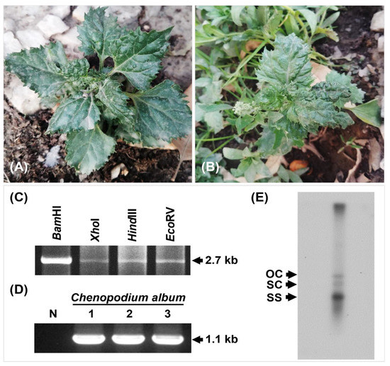 Amplification of virus DNA from the symptomatic Chenopodium album plant and confirmation of viral infection; (A,B) symptomatic samples with leaf distortion symptoms collected and processed. (C) Digestion of RCA product using restriction enzymes BamHI, XhoI, HindIII, and EcoRV. (D) PCR processing using begomovirus-specific primers of C. album samples. N: Negative control, Lane 1–3: C. album samples processed. (E) Southern blot hybridization of one symptomatic C. album sample to confirm virus infection. OC: open circular, SC: supercoiled, SS: single-stranded.