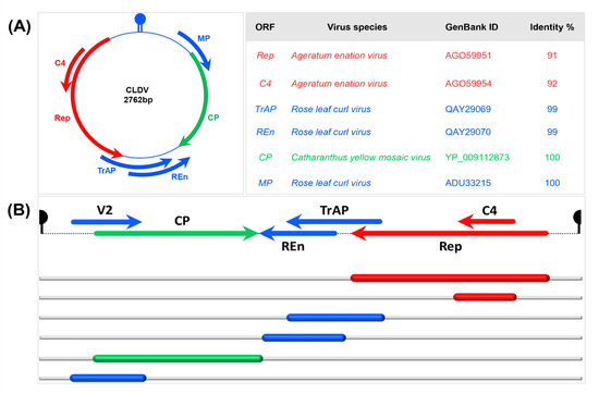 DNA-A of CLDV contained six ORFs following the Old World organization. Sequence analysis (amino acid level) of each ORF using BLASTX showed that AC1, which encodes Rep protein, showed 91% identity with AC1 of AEV (AGO59951) and AC4 showed 92% identity with AC4 of AEV (AGO59954). Similarly, AC2 (TrAP) and AC3 (REn) were 99% identical to the AC2 and AC3 of the RLCV (QAY29069) and (QAY29070), respectively. The ORF AVI (CP) was 100% similar to AV1 of CYMV (YP_009112873), and AV2 showed 100% identity with AV2 of RLCV (ADU33215) (Figure 2A,B). (Detailed comparison of the sequence homology of each ORF of CLDV with the ORFs of other viruses is provided in Supplementary Figure S2 and Supplementary Table S2). In the overlapping regions: CP/MP (Δ1) and Rep/TrAP (Δ2), RLCV was found more identical to CLDV than CYMV and AEV respectively (Supplementary Figure S3). The similarities and differences in the DNA-A of the newly identified virus with the reference sequences are highly noticeable and make a strong case for proving the identity of CLDV as a separate new species.