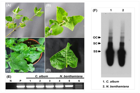 Infectivity of CLDV infectious clones in C. album and N. benthamiana samples. The results of inoculation assays of CLDV clones observed in (A,B) C. album and (C,D) N. benthamiana 28 dpi. Mild symptoms were induced by CLDV in both C. album and N. benthamiana samples. (E) Successful detection of CLDV (1.4 kb amplicon) was done through PCR in all three C. album samples and three N. benthamiana samples. The mock plant was used as the negative control whereas DNA extracted from one of the infected plants from Pakistan was used as the template for positive control in PCR processing. N: negative control, P: positive control, Lane 1–3: C. album samples, Lane 4–6: N. benthamiana samples processed. (F) Southern blot hybridization data for infection confirmation purpose, Lane 1: C. album sample, Lane 2: N. benthamiana sample. OC: open circular, SC: supercoiled, SS: single-stranded.