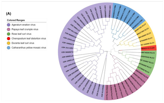 A total of 56 full-length DNA-A sequences of AEV (30), RLCV (5), CYMV (6), PaLCrV (9), and DLCV (5) were used in this study including the sequence of CLDV (Supplementary Table S1). BLASTn analysis of CLDV showed the sequence identity of these selected viruses though the percentage varies. All sequences were retrieved from the GenBank database (www.ncbi.nlm.nih.gov (accessed on 23 November 2021)) and were aligned at the nicking site in the nonanucleotide motif at the origin of replication (5′-TAATATT//AC-3′). All multiple-sequence alignments were constructed using the MUSCLE method as implemented in MEGA X [51] and manually corrected as well. Phylogenetic tree construction was performed using Mr. Bayes software version 3.2.7a provided by the CIPRES server [52]. In addition, distances were corrected with the best fit model estimated with jModelTest v2.1.6 on XSEDE on the CIPRES Gateway [52,53,54]. Visualization and editing of phylogenetic trees were carried out using a Newick file generated through FigTree in iTOL [55]. The full-length genome sequences of these top hits aligned with the MUSCLE algorithm were subjected to pairwise comparison using SDT v1.2 [56].