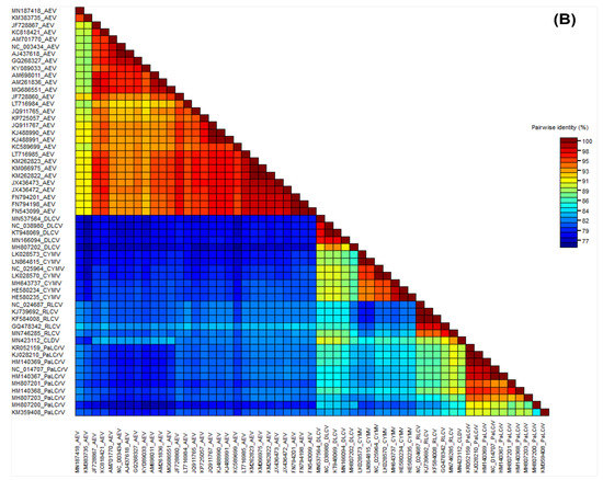 (A) Phylogenetic tree generated based on an alignment of the sequences of genomic components (DNA-A) of all viruses with a high percentage identity to CLDV. (B) Pairwise complete nucleotide sequence comparison of begomoviruses. Color-coded pairwise identity matrix was generated using the sets of begomovirus sequences by using the SDTv1.2.
