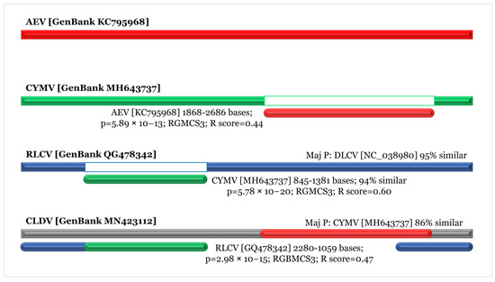 Recombination analysis of recombinant CLDV identified in this study. Recombination events were identified and found between the isolates of the CYMV, AEV, and RLCV.
