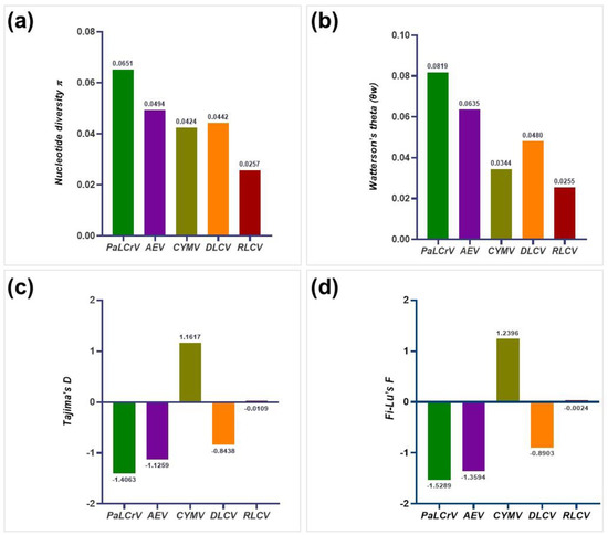 Estimation of genetic diversity was performed for AEV, DLCV, PaLCrV, RLCV, and CYMV populations. The calculated population genetic parameters include (a) nucleotide diversity (π), (b) Watterson’s theta (θw), (c) Tajima’s D, and (d) Fi-Lu’s F.