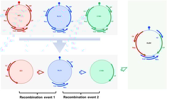 Interspecific interactions play a primary role in the diversification and organization of life [1]. Numerous recurrent formations of allopolyploid species have been reported in the plant and animal kingdoms [2,3]. Genetic recombination is a major source of genetic variability in viruses and creates new opportunities for the viruses to overcome selection pressures [4,5,6,7]. The expansion of viral host ranges, alteration of transmission vector specificities, and increases in virulence and pathogenesis are associated with recombination [8,9,10]. Recombination between isolates of different species as a source of speciation has been reported widely [11]. Among the DNA viruses, the role of recombination in geminiviruses (family: Geminiviridae) in the formation of new DNA virus species is well-documented [12,13,14] and, therefore, plays an essential role in geminivirus diversification and evolution [15,16,17].
