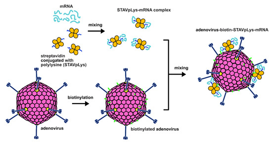 Schematic illustration of a novel chimeric nanosystem for mRNA delivery. In this study, we employed a straight-forward three step approach to prepare AdpL-mRNA complexes. Anionic mRNA is first mixed with cationic streptavidin tagged polylysine to form complexes capable of binding with biotin. In parallel, the adenovirus is biotinylated via chemical labelling of accessible amine groups using the EZ-Link kit. Lastly, the complexed STAVpLys-mRNA is conjugated to the biotinylated virus via simple mixing. This strategy allows for rapid generation of a functional mRNA vector using a pre-prepared adenovirus.