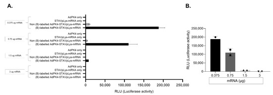 Evaluation of gene transfer efficiency mediated by AdPK4-STAVpLys-mRNA complexes. To evaluate mRNA gene transfer mediated by the AdpL vector, a fixed quantity of biotinylated virus (Figure S1) containing 800 ng StAV conjugated with 880 ng pLys was complexed with different amounts of mRNA (0.375, 0.75, 1.5, or 3 ug) and tested in CHO cells by measuring luciferase gene expression forty-eight hours after virus infection in parallel with controls Average of three technical replicates (A). Presentation of the dose-dependence of mRNA gene transfer efficiency. Average of two technical replicates (B).